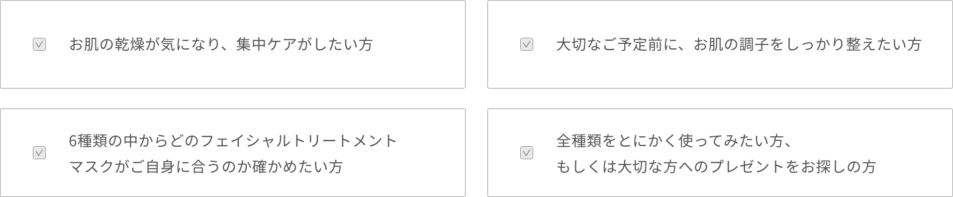 6種類の中からどのフェイシャルトリートメントマスクがご自身に合うのか確かめたい方、