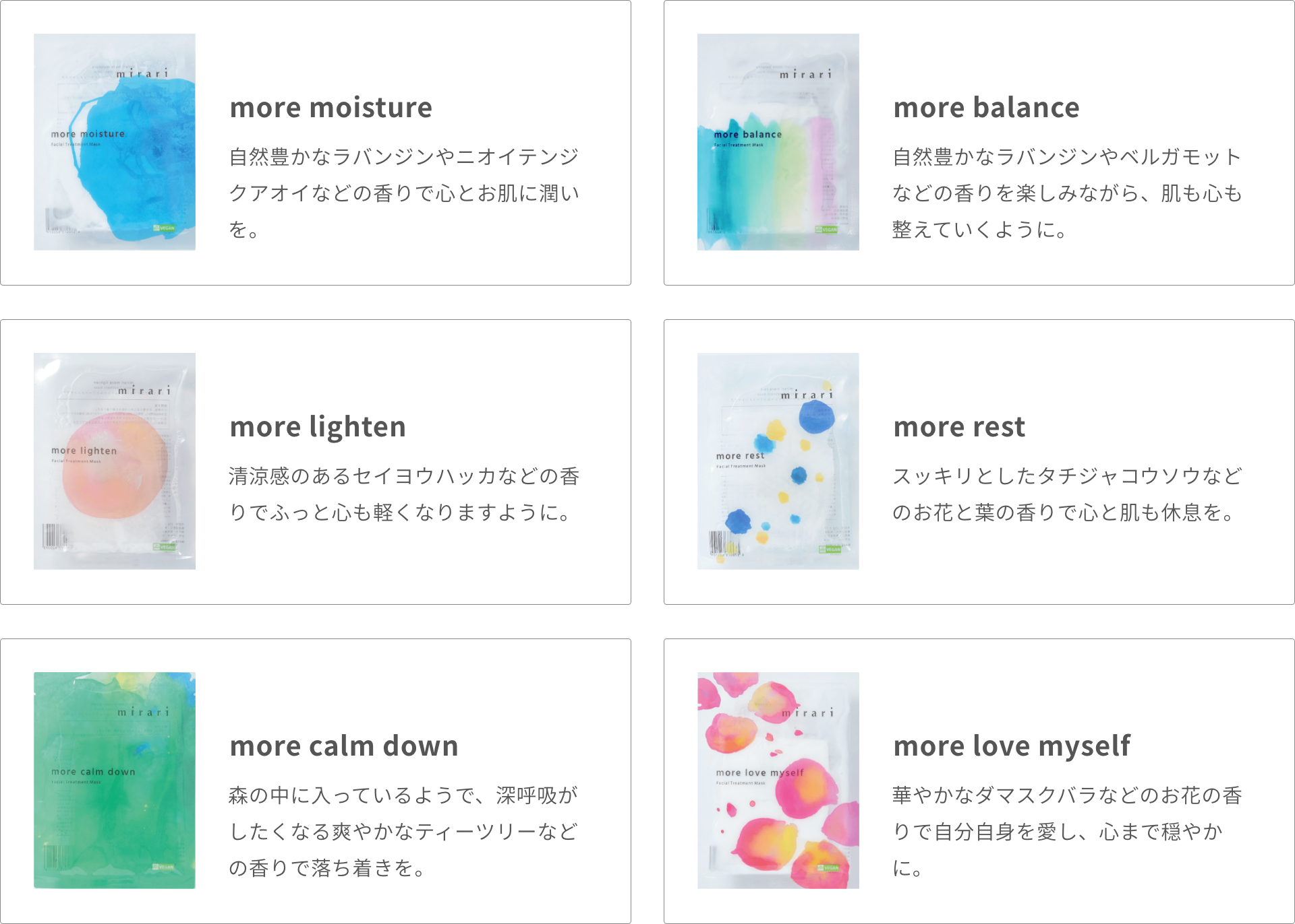 それぞれのマスクに、肌の悩みに合わせた最適な天然植物由来成分を惜しみなくブレンドしております。「more love myself」には17種アミノ酸複合体を、「more moisture」にはAQUALICIAを配合するなど、肌のすこやかさを支えるためのこだわりが詰まっています。