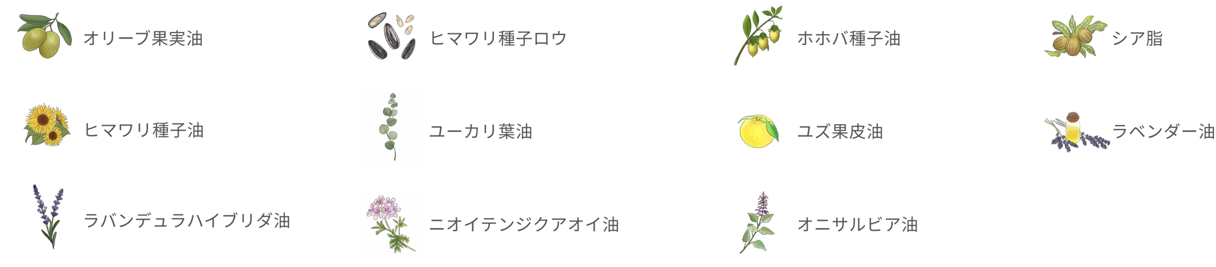 オリーブ果実油、ヒマワリ種子ロウ、ホホバ種子油、(イソステアリン酸/ベヘン酸)(グリセリル/ポリグリセリル-6)エステルズ、デカイソステアリン酸ポリグリセリル-10、シア脂、バクチオール、ヒマワリ種子油、セラミドAP、セラミドNP、トコフェロール、ユーカリ葉油、ユズ果皮油、ラベンダー油、ラバンデュラハイブリダ油、ニオイテンジクアオイ油、オニサルビア油