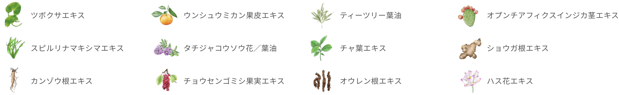 ツボクサエキス、ウンシュウミカン果皮エキス、ティーツリー葉エキス、オプンチアフィクスインジカ茎エキス、スピルリナマキシマエキス、 タチジャコウソウ花/葉油など、多くの天然植物由来成分をたっぷり配合しました。