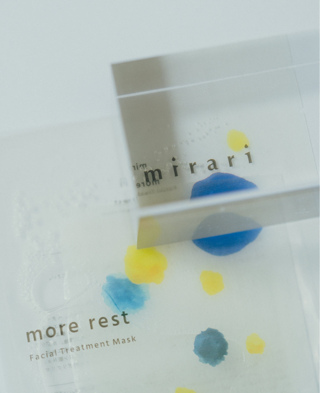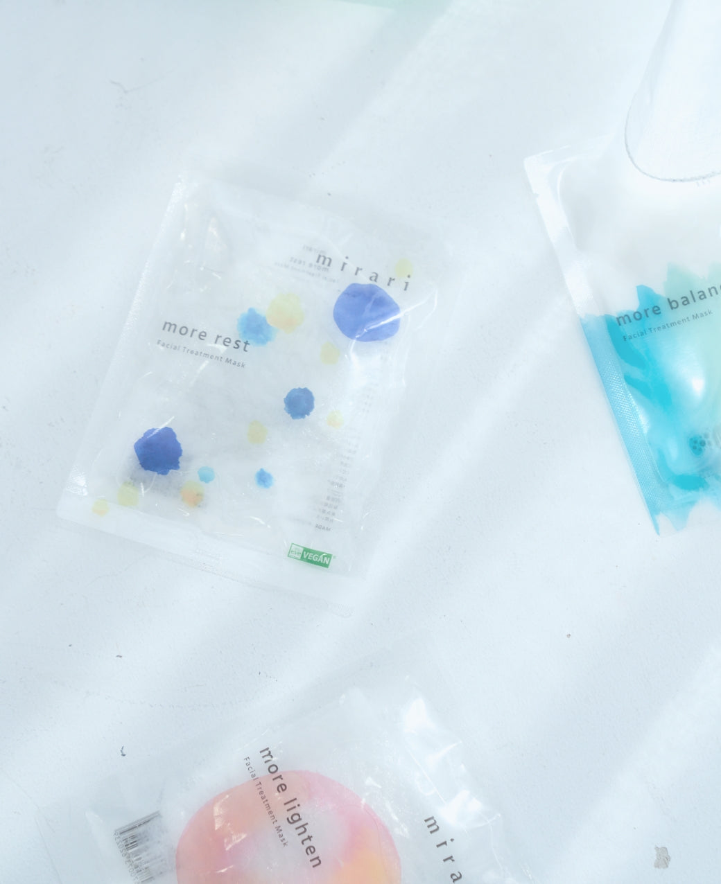 「mirari」のフェイシャルトリートメントマスク全種類は、今までなかなか実現できなかった透明パウチを開発しました。こちらの透明パウチは中のエキスやシートが劣化しない最新技術を活かせており、お使いの際にプロダクトの中が全て見えて安心できるものに仕上げました。