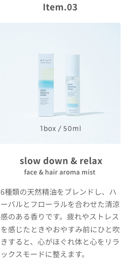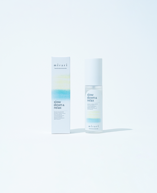 「slow down & relax」アロマミストは、100%天然由来成分で処方しており、ツボクサ葉エキス、(アスペルギルス/サッカロミセス)/コメ発酵エキス液、ドクダミエキス、アマチャヅル葉エキス、アーチチョーク葉エキスが、肌荒れを防ぎつつ肌を引き締め整えます。