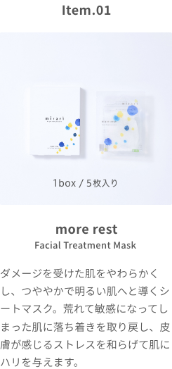 「more rest」 フェイシャルトリートメントマスクは、あなたの肌はもちろん、心の中までゆっくり休むことができますように、その想いを込めて作りました。
