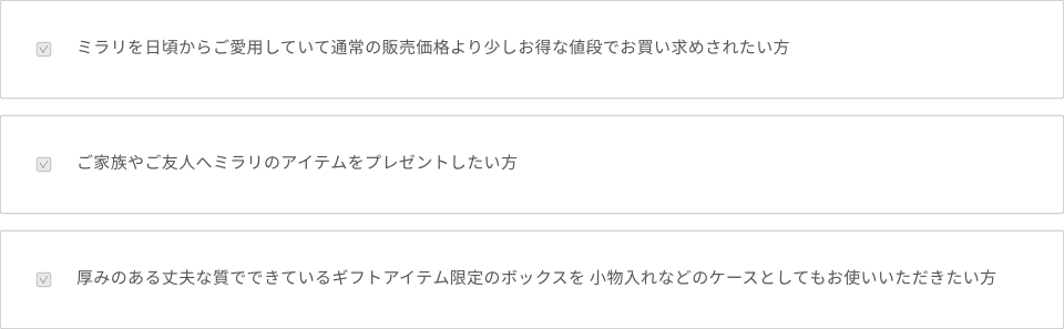 ミラリ公式オンラインストアから直接ギフト配送される方には、オリジナルのポストカードにご希望のメッセージを300字以内で印字するサービスを行っています。ご希望の方は、ご注文時のカート画面の備考欄にご記入ください。