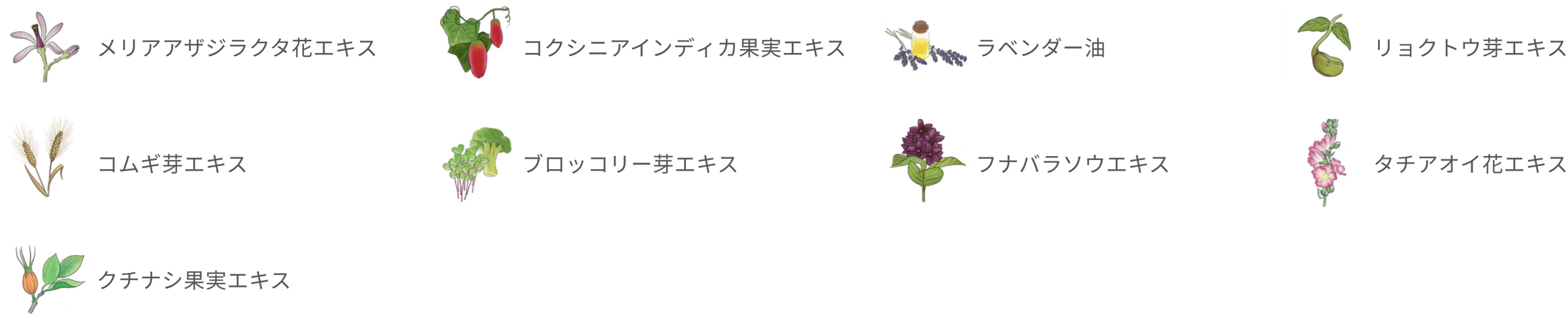 水、グリセリン、1,2ーヘキサンジオール、メリアアザジラクタ花エキス、コクシニアインディカ果実エキス、ラベンダー油、リョクトウ芽エキス、コムギ芽エキス、ブロッコリー芽エキス、フナバラソウエキス、タチアオイ花エキス、クチナシ果実エキス、トレハロース、フィチン酸Na、トリ(カプリル酸/カプリン酸)グリセリル、水添レシチン、トコフェロール、セルロースガム、ヒアルロン酸Na、コクハ酸ジエトキシエチル、デキストリン、セラミドNP、カプリリルグリコール、アラントイン、パンテノール、アルギニン、カフェイン、BG、ベタイン、ラウリン酸ポリグリセリルー10、トロメタミン、エチルヘキシルグリセリン、ステアロイルグルタミン酸Na、(アクリレーツ/アクリル酸アルキル(C10-30))クロスポリマー、(アクリロイルジメチルタウリンアンモニウム/VP)コポリマー
