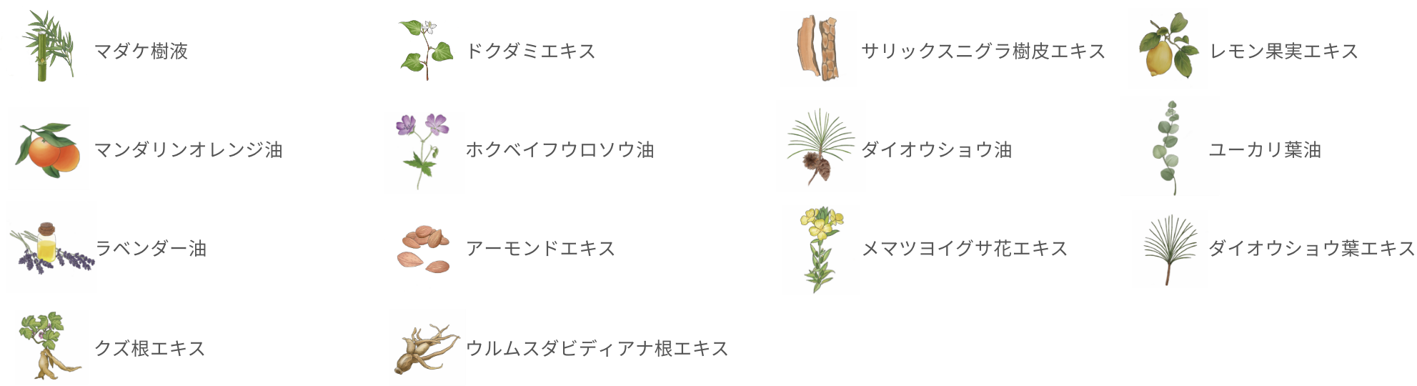 マダケ樹液、ドクダミエキス、水、BG、1,2-ヘキサンジオール、グリセリン、サリックスニグラ樹皮エキス、レモン果実エキス、マンダリンオレンジ油、ホクベイフウロソウ油、ダイオウショウ油、ユーカリ葉油、ラベンダー油、アーモンドエキス、メマツヨイグサ花エキス、ダイオウショウ葉エキス、クズ根エキス、ウルムスダビディアナ根エキス、(アクリロイルジメチルタウリンアンモニウム/VP)コポリマー、ラウリン酸ポリグリセリル-10、ミリスチン酸ポリグリセリル-10、エチルヘキシルグリセリン、EDTA-2Na