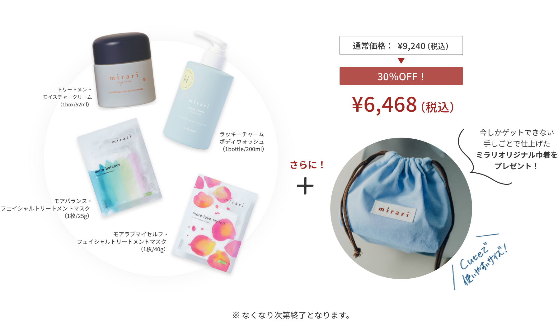 通常価格から30%OFFとなり、さらにミラリオリジナル巾着をプレゼント!