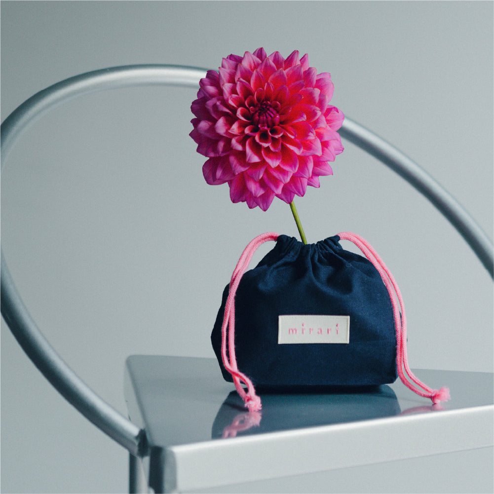 「つぼみ巾着」という愛称で私たちは呼んでいます。キュッと紐を結んだそのシルエットは、春の訪れを静かに待つ「花の蕾(つぼみ)」を思わせる佇まい。