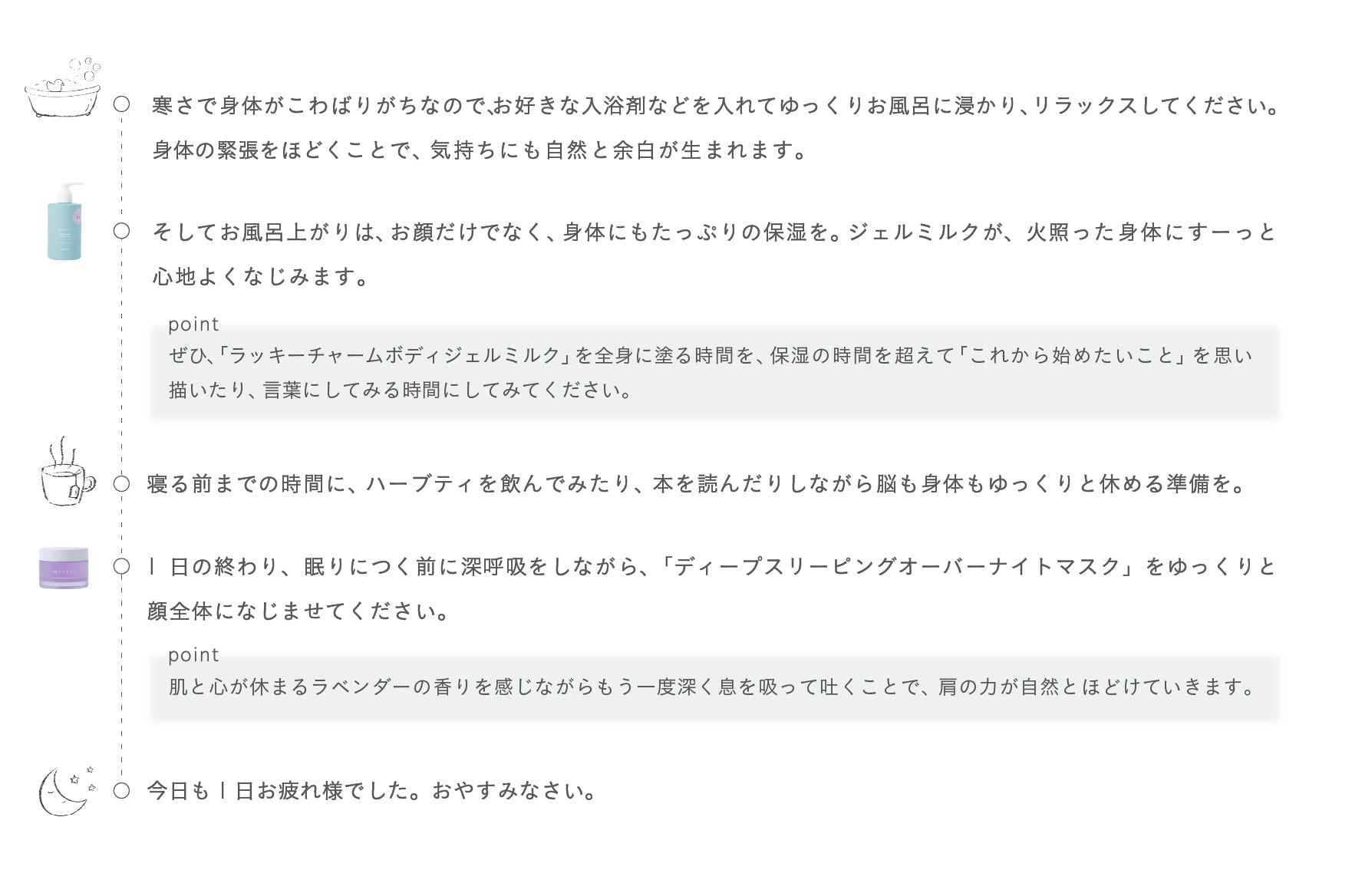 自分の手でそっと包み込むように、ジェルミルクでほぐしながらやさしくうるおいで満たす。