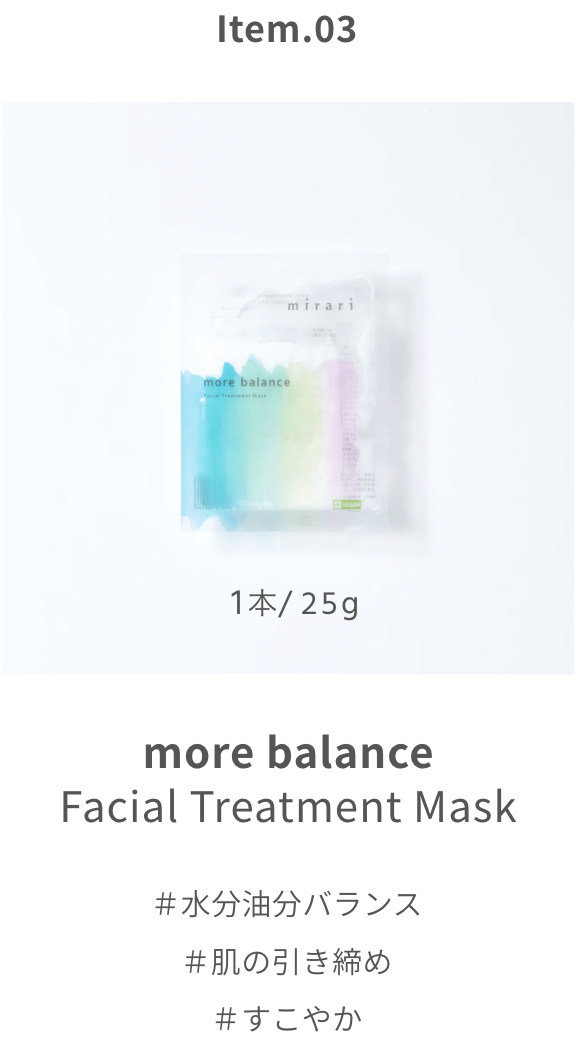 「more balance」 フェイシャルトリートメントマスクは、あなたの肌はもちろん、心の中まで今の素晴らしいバランスを維持できますように、その想いを込めて作りました。