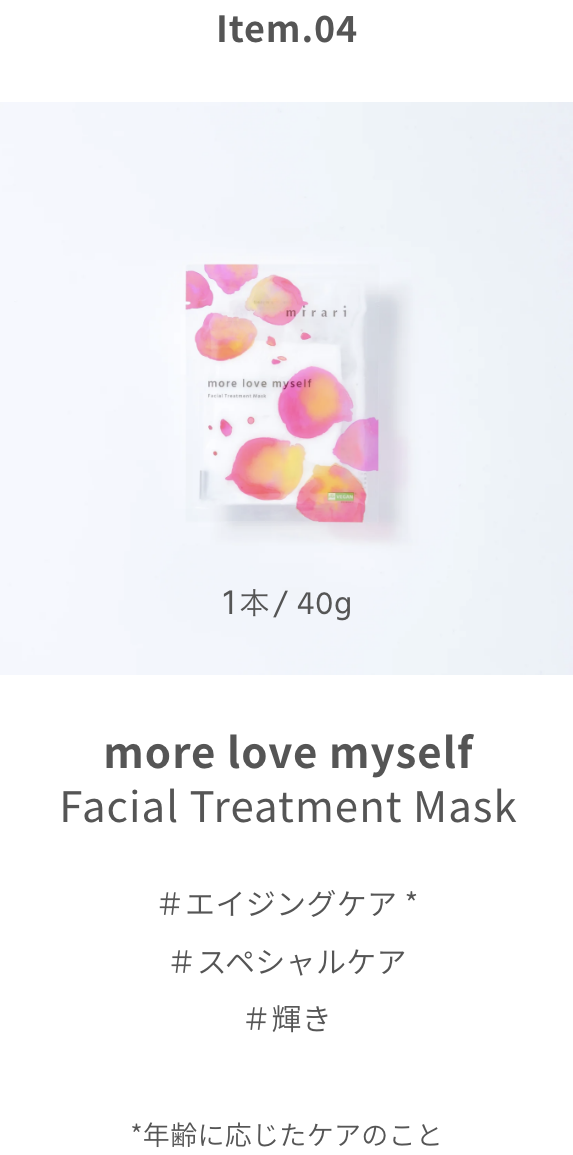 「more love myself」 フェイシャルトリートメントマスクは、自分自身のことをもっと愛するための贅沢な時間になりますように、その想いを込めて作りました。