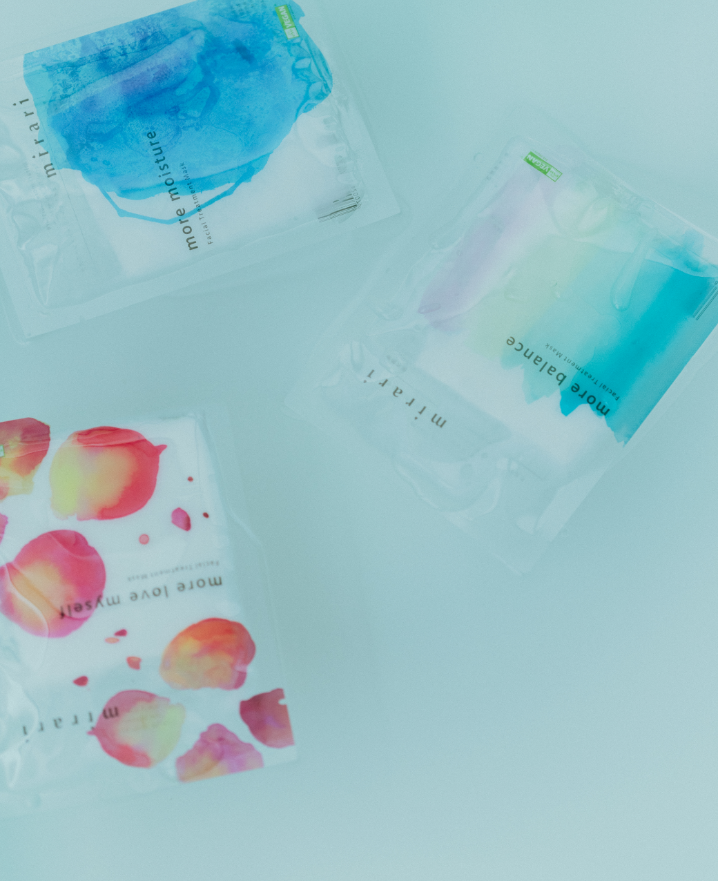 「mirari」のフェイシャルトリートメントマスク全種類は、今までなかなか実現できなかった透明パウチを開発しました。こちらの透明パウチは中のエキスやシートが劣化しない最新技術を活かせており、お使いの際にプロダクトの中が全て見えて安心できるものに仕上げました。