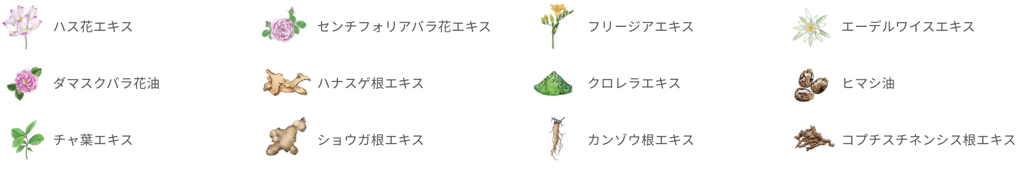 水、BG、グリセリン、トリ(カプリル酸/カプリン酸)グリセリル、1,2-ヘキサンジオール、パンテノール、ステアリン酸グリセリル、ステアリン酸ソルビタン、セスキオレイン酸ソルビタン、アラントイン、アルギニン、カルボマー、キサンタンガム、チャ葉エキス、ショウガ根エキス、カンゾウ根エキス、コプチスチネンシス根エキス、ヒマシ油、ダマスクバラ花油、クロレラエキス、ハス花エキス、センチフォリアバラ花エキス、フリージアエキス、エーデルワイスエキス、ハナスゲ根エキス、アデノシン、エチルヘキシルグリセリン、ヤシ脂肪酸スクロース、EDTA-2Na、ヒアルロン酸Na、水添ポリイソブテン、加水分解ヒアルロン酸、グリシン、セリン、グルタミン酸、アスパラギン酸、ロイシン、アセチルヒアルロン酸Na、アラニン、リシン、チロシン、フェニルアラニン、プロリン、バリン、トレオニン、イソロイシン、ヒスチジン、メチオニン、システイン