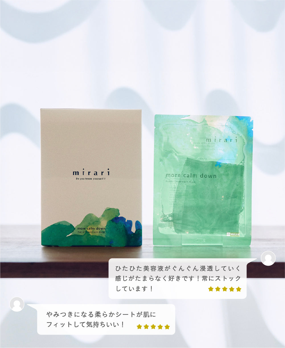ツボクサやドクダミなど、肌を穏やかに整える天然植物由来成分を凝縮させ、肌の落ち着きを取り戻す効果を持つ「more calm down」フェイシャルトリートメントマスク。