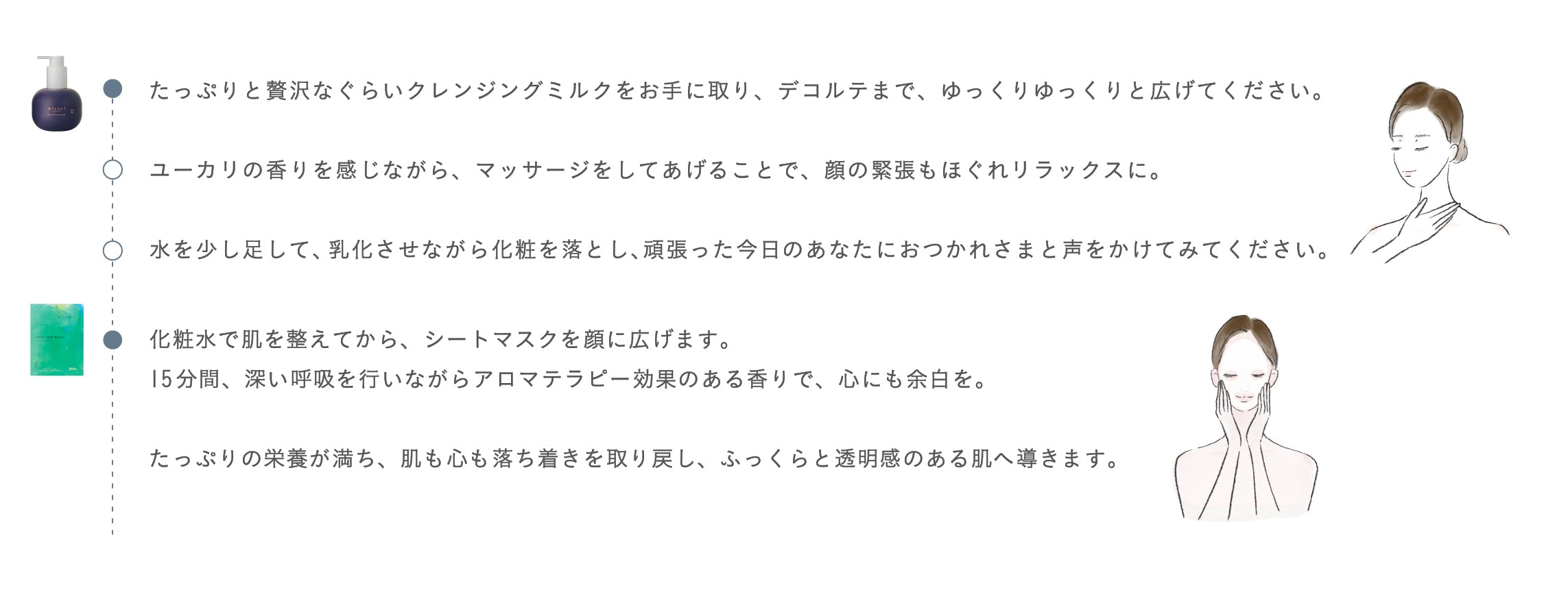 一日を終えるケアの時間が、 まるで今日という一日の心残りをそっと消していくような、穏やかなひとときへと導きます。